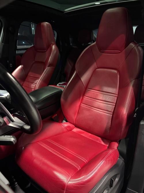 التنجيد والمقاعد: المقصورة الداخلية مزودة بتنجيد جلد فاخر باللون الأحمر الداكن، ما يمنح السيارة طابعاً رياضياً وفاخراً في نفس الوقت. المقاعد الرياضية الأمامية مزودة بوظائف تدفئة وتبريد، مما يضمن لك راحة استثنائية في جميع الفصول.